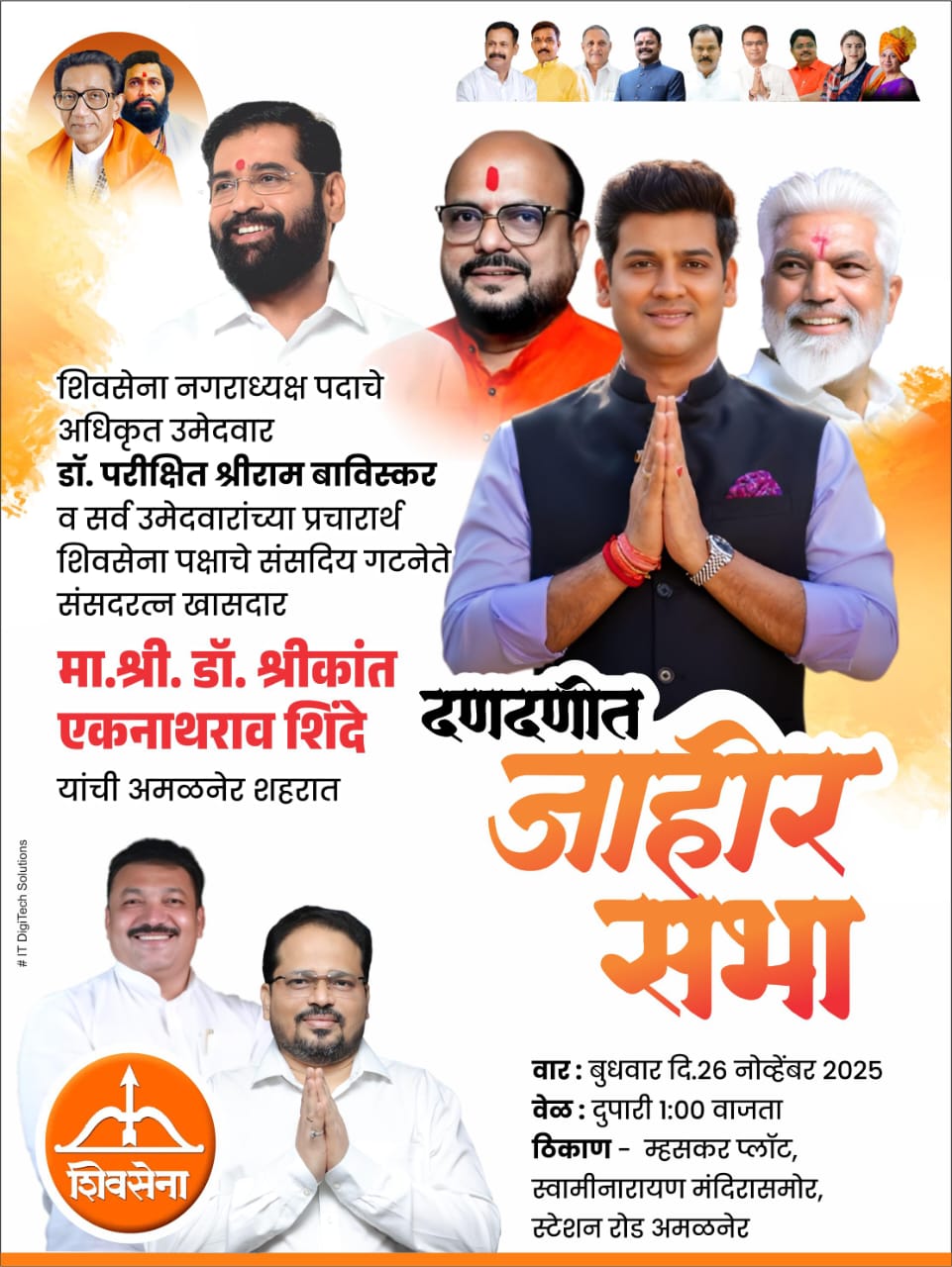 अमळनेर (प्रतिनिधी) – अमळनेर नगरपरिषद सार्वत्रिक निवडणुकीचे वातावरण चांगलेच तापले असून, स्टार प्रचारकांच्या सभांमुळे यात अधिक रंगत येत आहे. याच पार्श्वभूमीवर, शिवसेनेचे लोकनियुक्त नगराध्यक्ष पदाचे उमेदवार डॉ. परिक्षीत बाविस्कर आणि नगरसेवक पदाचे उमेदवार यांच्या प्रचारार्थ शिवसेनेचे संसदीय गटनेते, संसदरत्न खासदार डॉ. श्रीकांतजी शिंदे यांची जाहीर सभा उद्या अमळनेरात आयोजित करण्यात आली आहे.उद्या, बुधवार, दिनांक २६ नोव्हेंबर रोजी दुपारी ०२:०० वाजता होणार आहे. शहरातील म्हसकर प्लॉट, स्वामी नारायण मंदिर, स्टेशन रोड, अमळनेर या ठिकाणी होणार आहे.