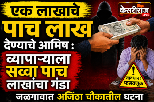 जळगाव ( प्रतिनिधी ) : गुंतवणुकीवर मोठ्या परताव्याचे आमिष दाखवून फसवणूक करणाऱ्या टोळीने जळगावच्या एका व्यापाऱ्याला ५ लाख २० हजार रुपयांना लुटल्याची धक्कादायक घटना उघडकीस आली आहे. ‘एक लाखाचे पाच लाख रुपये करून देतो’ असे सांगून पाच अज्ञात भामट्यांनी व्यापाऱ्याच्या मुलाकडून रोख रक्कम घेऊन पोबारा केला.