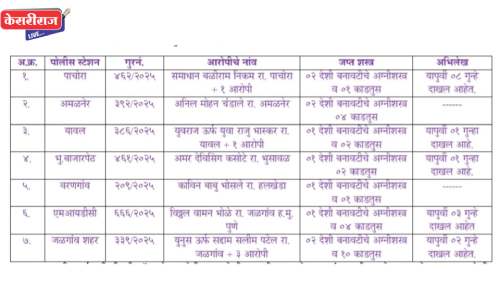 जप्त करण्यात आलेल्या शस्त्रांमध्ये देशी बनावटीच्या पिस्तुलांचा समावेश असून, काही आरोपींवर यापूर्वीही गंभीर स्वरूपाचे गुन्हे दाखल असल्याचे पोलीस अभिलेखावरून स्पष्ट झाले आहे. ही विशेष मोहीम पोलीस अधीक्षक डॉ. महेश्वर रेड्डी, अपर पोलीस अधीक्षक अशोक नखाते, अपर पोलीस अधीक्षक, चाळीसगांव कविता नेरकर आणि सर्व उपविभागीय पोलीस अधिकारी यांच्या मार्गदर्शनाखाली स्थानिक गुन्हे शाखा आणि संबंधित पोलीस स्टेशनच्या अधिकारी व अंमलदार यांनी संयुक्तपणे यशस्वी केली. जळगाव जिल्ह्यात अवैध शस्त्र बाळगणाऱ्यांविरुद्ध यापुढेही कठोर कारवाई सुरूच राहील, असा इशारा जिल्हा पोलिसांनी दिला आहे.