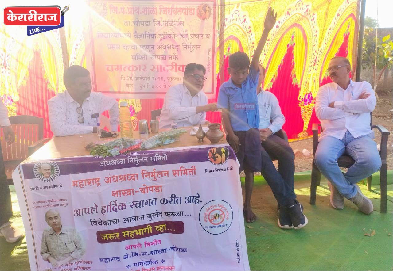 चोपडा (प्रतिनिधी):- आदिवासी भागातील विद्यार्थ्यांमध्ये वैज्ञानिक दृष्टिकोन रुजावा आणि अंधश्रद्धेचे निर्मूलन व्हावे, या उद्देशाने महाराष्ट्र अंधश्रद्धा निर्मूलन समिती (अंनिस) चोपडा शाखेतर्फे नुकतेच एका विशेष शिबिराचे आयोजन करण्यात आले होते. दि. १६ जानेवारी रोजी तालुक्यातील जिरायत पाडा येथील जिल्हा परिषद प्राथमिक शाळा तथा आश्रम शाळेत हा कार्यक्रम पार पडला.
