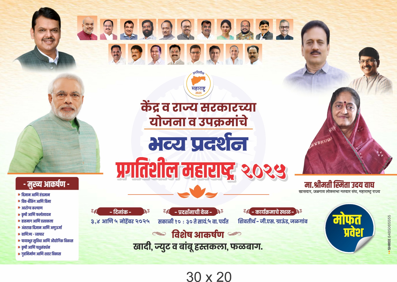 जळगाव, दि. १ (प्रतिनिधी): भारतीयांच्या जीवनात प्रगतीचे नवे दार उघडावे यासाठी केंद्र व राज्य सरकारच्या विविध विभागांच्या वतीने चालविणाऱ्या योजना व उपक्रमांची जळगाव जिल्ह्यातील सर्वसामान्य नागरिकांना माहिती व्हावी यासाठी खास प्रगतीशिल महाराष्ट्र २०२५ या भव्य प्रदर्शनाचे आयोजन करण्यात आले आहे. सोमवार दि. ३ ते बुधवार दि. ५ नोव्हेंबर दरम्यान जळगावच्या शिवतीर्थ -जीएस ग्राऊंडवर रंगणाऱ्या या आगळ्यावेगळ्या प्रदर्शनाला जळगावकरांनी भेट द्यावी, असे आवाहन खासदार स्मिताताई वाघ व आ राजूमामा भोळे व दिल्लीतील फ्रेंड्ज एक्झिबिशनच्या अखिला श्रीनिवासन यांनी केले आहे. शनिवार दि. १ नोव्हेंबर रोजी येथील हॉटेल सिल्व्हर पॅलेस येथे आयोजित केलेल्या पत्रकार परिषदेत हे मान्यवर बोलत होते.