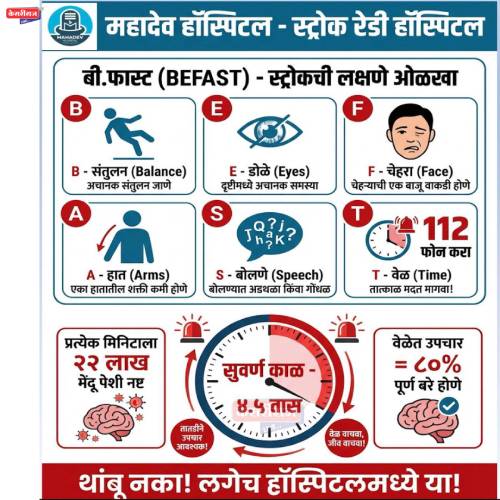 स्ट्रोक आल्यानंतरचे पहिले ४.५ तास अत्यंत महत्त्वाचे असतात. या काळात उपचार मिळाल्यास ‘थ्रोम्बोलिसिस’ (क्लॉट बस्टर इंजेक्शन) द्वारे मेंदूतील रक्ताची गाठ विरघळली जाऊ शकते. यामुळे मेंदूचे कायमस्वरूपी नुकसान टाळता येते आणि रुग्ण अर्धांगवायूपासून वाचू शकतो. महादेव हॉस्पिटलमध्ये २४ तास तज्ञ न्यूरोलॉजिस्ट, अत्याधुनिक सिटी स्कॅन, एमआरआय आणि विशेष स्ट्रोक आयसीयूची सुविधा उपलब्ध करण्यात आली आहे.