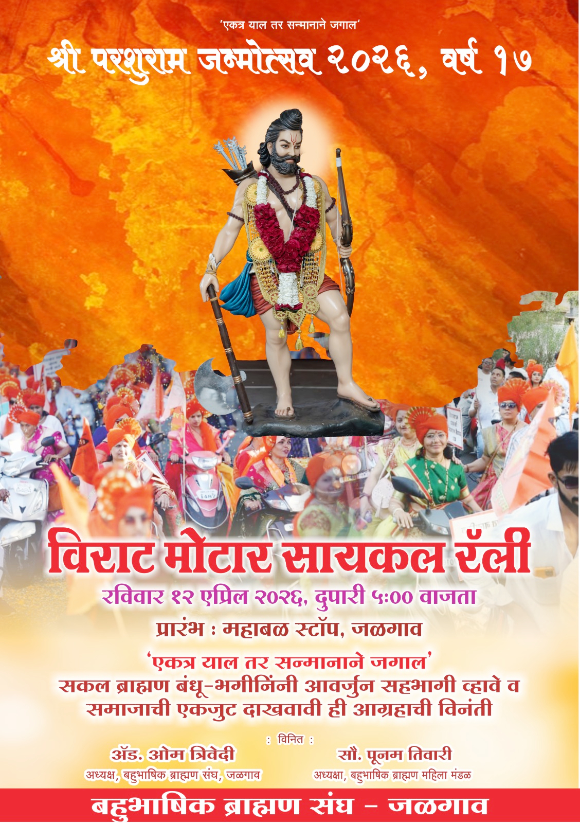 जळगाव (प्रतिनिधी) – भगवान श्री परशुराम जन्मोत्सव सोहळा २०२६ निमित्त वातावरण निर्मितीसाठी उद्या (दि.१२ एप्रिल ) सायंकाळी ५ वाजता बहुभाषिक ब्राह्मण संघाच्या वतीने विराट दुचाकी रॅलीचे आयोजन करण्यात आले आहे. या रॅलीत एक हजारांहून अधिक दुचाकी सहभागी होणार असल्याने शहरात उत्साहाचे वातावरण निर्माण झाले आहे.