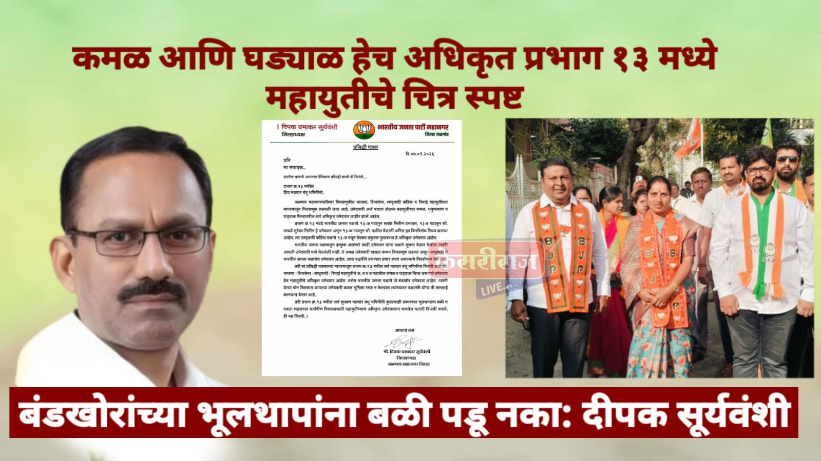 शहराच्या आणि प्रभागाच्या सर्वांगीण विकासासाठी महायुतीचे अधिकृत उमेदवार कटिबद्ध आहेत. “मतदारांनी कोणत्याही भूलथापांना किंवा अपक्ष उमेदवारांच्या खोट्या प्रचाराला बळी पडू नये. कमळ आणि घड्याळ या अधिकृत चिन्हांवरच आपले बहुमोल मत देऊन महायुतीच्या उमेदवारांना विजयी करावे,” अशी नम्र विनंती महायुतीतर्फे दीपक सूर्यवंशी यांच्यातर्फे करण्यात आली आहे.