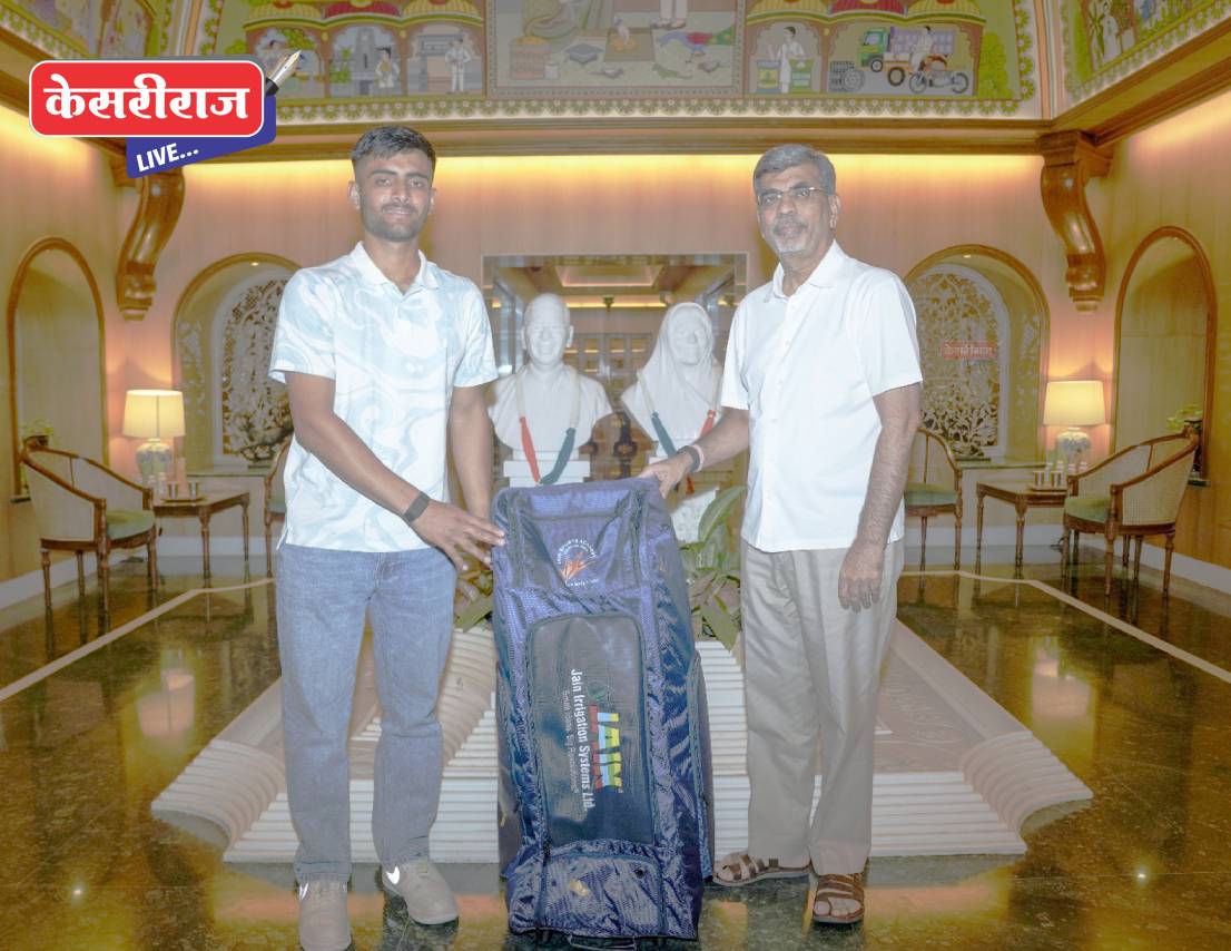 फोटो कॅप्शन – निरज जोशी याचा क्रिकेट किट देऊन सम्मान करताना अतुल जैन.