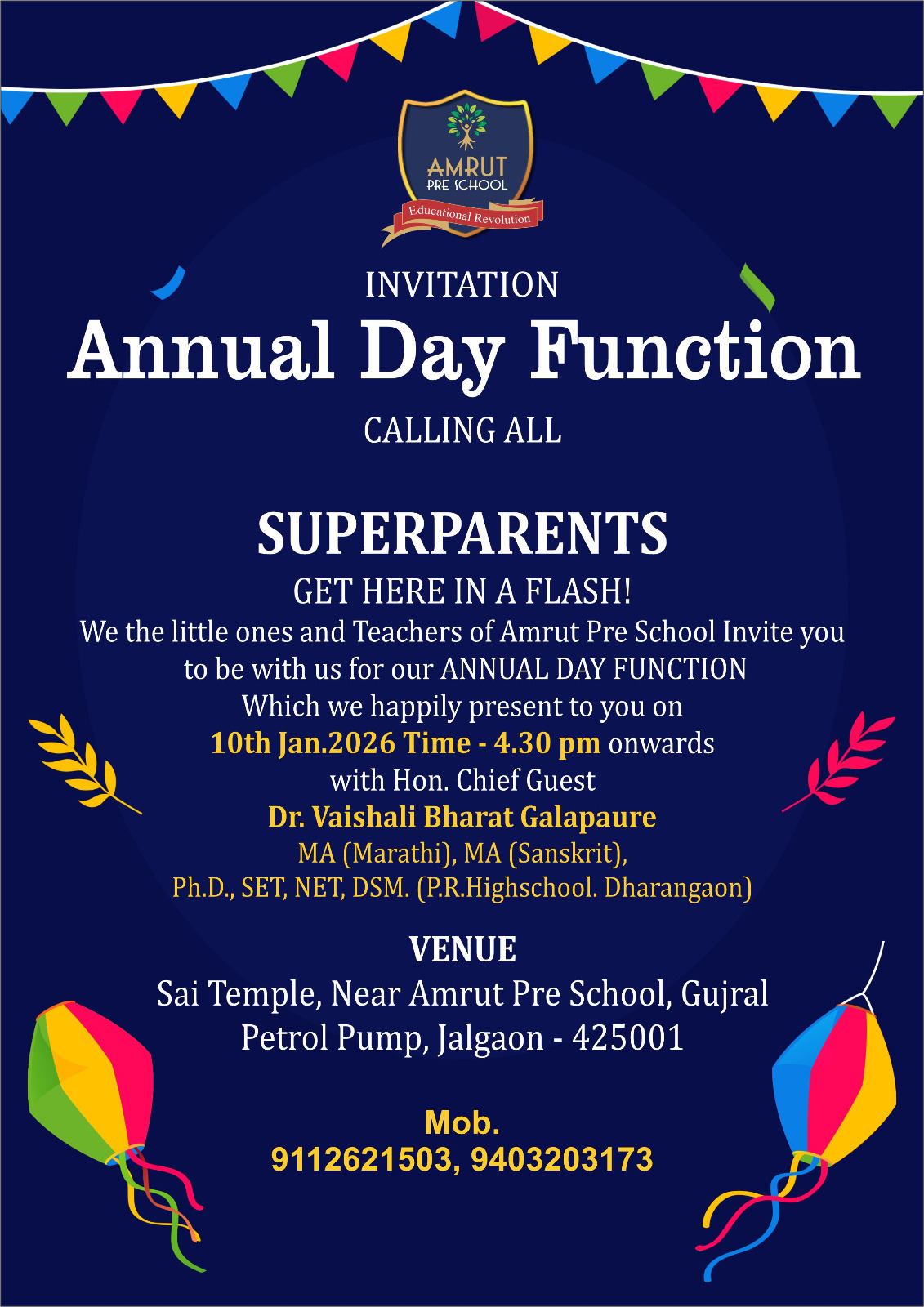 कार्यक्रमाचे बहारदार सूत्रसंचालन शिक्षिका हेमांगी देशमुख व पुजा पाटील यांनी केले, तर उपस्थितांचे आभार निकिता जाधव यांनी मानले. या यशस्वी आयोजनामुळे अमृत प्री-स्कूलच्या शैक्षणिक व सांस्कृतिक शिरपेचात मानाचा तुरा रोवला गेला आहे.