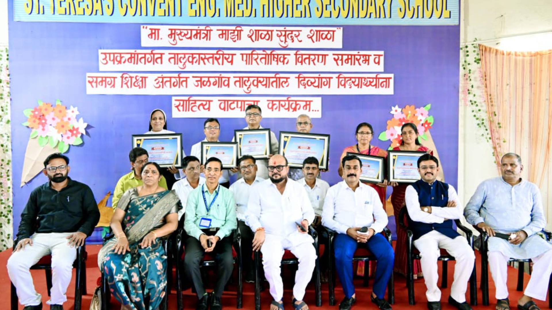 सुरुवातीला “मुख्यमंत्री, माझी शाळा – सुंदर शाळा” या उपक्रमाचे उद्घाटन पालकमंत्री गुलाबराव पाटील यांच्या हस्ते करण्यात आले. शिक्षण विभाग तर्फे सेंट टेरेसा हायर सेकंडरी स्कूल जळगाव येथे आयोजित मुख्यमंत्री माझी शाळा सुंदर शाळा’ अभियान टप्पा क्रमांक एकचे तालुकास्तरीय पारितोषिक वितरण तसेच समग्र शिक्षा अंतर्गत दिव्यांग विद्यार्थ्यांना साहित्य वाटप पालकमंत्री गुलाबराव पाटील व मान्यवरांच्या हस्ते करण्यात आले. या प्रसंगी डायट प्राचार्य अनिल झोपे, गटशिक्षणाधिकारी सरला विजय पाटील, शालेय पोषण आहार अधीक्षक विजय पवार, शिक्षण विस्तार अधिकारी खलील शेख, जितेंद्र चिंचोले, मनोज पाटील, ज्ञानेश्वर सोनवणे, नरेंद्र सपकाळे, सचिन पवार, मिलिंद बागुल, कादर कच्ची, सिस्टर जुलीएट, जितेंद्र पाटील यांच्यासह शिक्षक मोठ्या संख्येने उपस्थित होते.