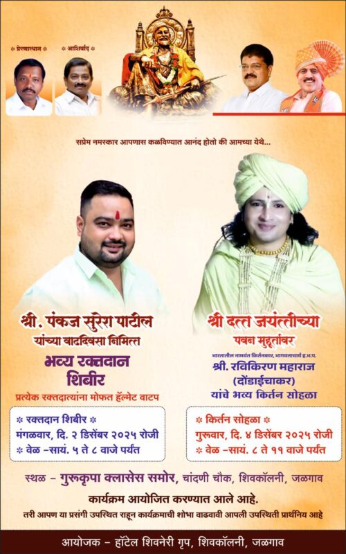 जळगाव (प्रतिनिधी) :- शहरातील शिवनेरी ग्रुप आणि पंकज पाटील मित्र परिवारातर्फे मंगळवार दि. २ डिसेंबर रोजी भव्य रक्तदान शिबिर आयोजित करण्यात आले आहे. तसेच दत्त जयंतीच्या पावन मुहूर्तावर भव्य कीर्तन सोहळा गुरुवार दि. ४ डिसेंबर रोजी आयोजित करण्यात आला आहे. नागरिकांनी रक्तदानासाठी पुढाकार घ्यावा, किर्तन सोहळ्याला उपस्थिती द्यावी असे आवाहन आयोजकांनी केले आहे.